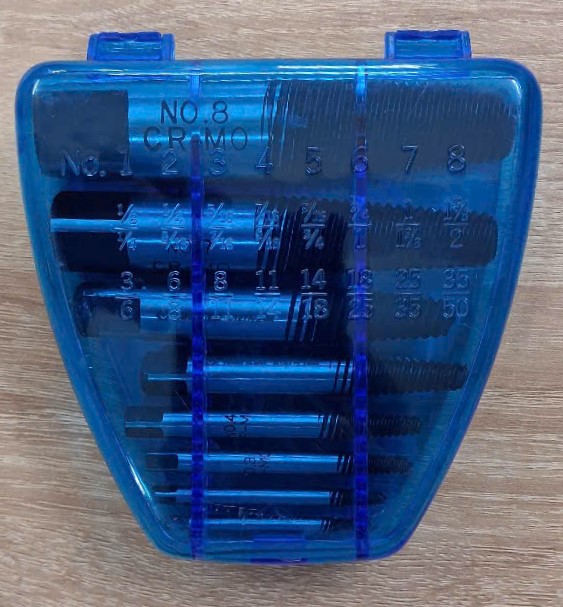 - Mã sản phẩm: 11208SQ. Bộ tháo bu lông, đai ôc gãy 8 chi tiết, cở tháo bu lông từ 3 - 50mm, chất liệu Thép Cr-MO, trọng lượng 0.85 Kg.