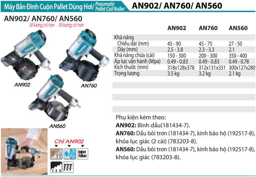 - Mã sản phẩm: AN902. Áp suất làm việc 0.49 - 0.83 Mpa, đầu hơi vào 1/4 Inch, trọng lượng 3.5Kg.