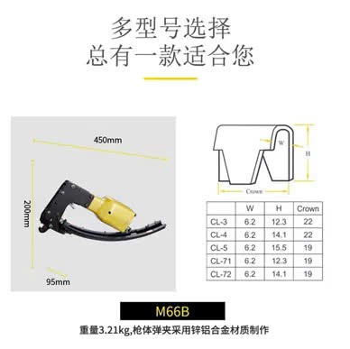 - Mã sản phẩm: M66B. Máy bắn đinh dùng hơi, áp suất hơi 6 - 9 Kg/cm2, trọng lượng 3.15 Kg.