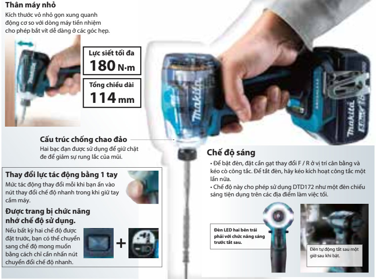 - Mã sản phẩm: DTD172RTE: Máy vặn vít dùng pin. Động cơ không chỗi than, điện áp 18V, tốc độ không tải tối đa 3.600 vòng/phút, tốc độ đập tối đa 3.800 lần/phút, trọng lượng bao gồm pin 1.2 - 1.5 Kg
