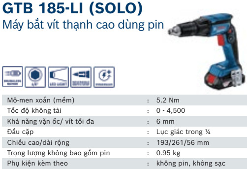 - Mã sản phẩm: GTB 185-LI (SOLO) chưa bao gồm pin và sạc. Máy bắt vít thạch cao dùng pin, động cơ không chổi than điện áp 18V, tốc độ không tải max 4.500 vòng/phút, trọng lượng máy không bao gồm pin 0.95Kg