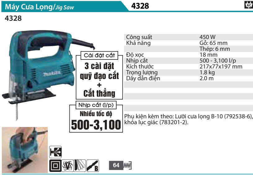 - Mã sản phẩm: 4328. Điện áp 220V, công suất 450W, nhịp cắt tối đa 3.100 lần/phút, độ sọc 18mm, trọng lượng 1.8Kg.