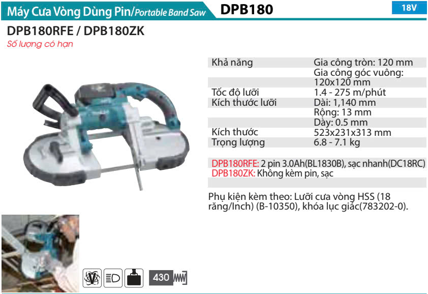 - Mã sản phẩm: DPB180ZK. Điện áp 18V, động cơ chổi than, tốc độ lưỡi tối đa 2.75 mét/giây, khả năng cắt tối đa 120mm, trọng lượng bao gồm pin 6.8 - 7.1Kg.