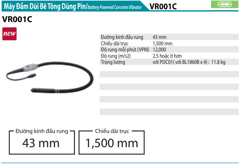 - Mã sản phẩm: VR001C: Máy đầm dùi dùng pin, đường kính đầu rung 43mm, điện áp 18V*4, độ rung mỗi phút 12.000 vòng/phút, trọng lượng bao gồm pin 11.8 Kg