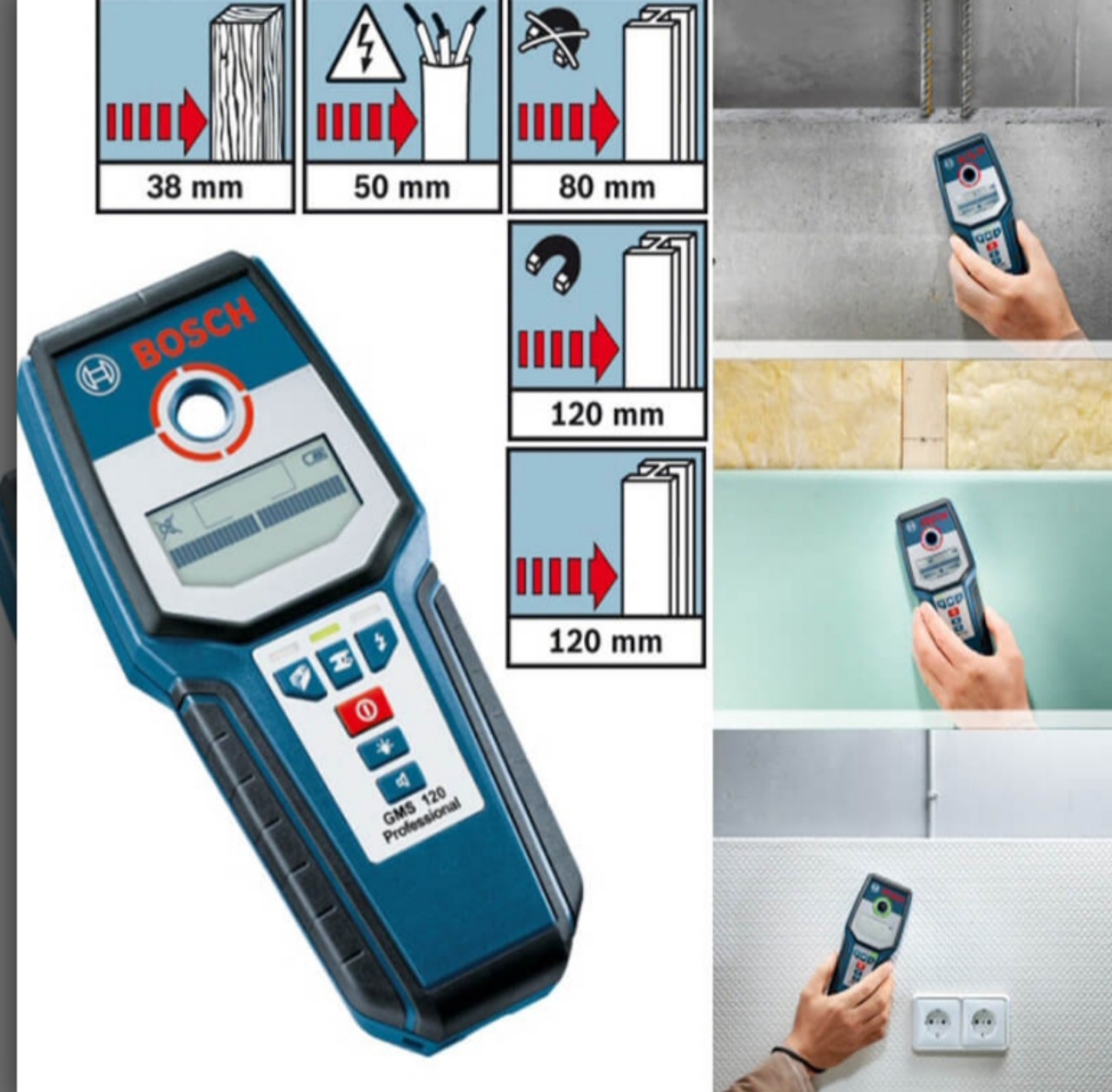 - Mã sản phẩm: GMS 120. Dùng để định vị kim loại và dây điện trong các loại tường khác nhau cũng như các cấu trúc bên bằng gỗ trong tường khô, phát hiện các vật thể trong tường trước khi khoan để tăng độ an toàn, phù hợp cho công việc sửa chữa lại, cấp bảo vệ máy IP54, trọng lượng 270g.