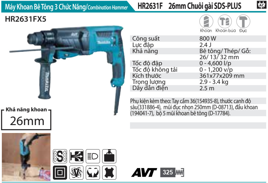 - Mã sản phẩm: HR2631FX5. Máy khoan bê tông 3 chức năng (khoan, khoan búa, đục), công suất 800W, tốc độ không tải tối đa 1.200 vòng/phút, tốc độ đập tối đa 4.600 lần/phút, lực đập 2.4J, trọng lượng 2.9 - 3.4Kg.