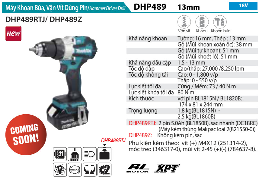 - Mã sản phẩm: DHP489Z (chưa bao gồm pin và sạc): Máy khoan búa, vặn vít dùng pin. 2 cấp tốc độ. 3 chức năng (khoan, vặn vít, khoan búa). Động cơ không chổi than, điện áp 18V, tốc độ không tải tối đa 1.800 vòng/phút, lực đập tối đa 27.000 lần/phút, trọng lượng bao gồm pin 1.8 - 2.5 Kg