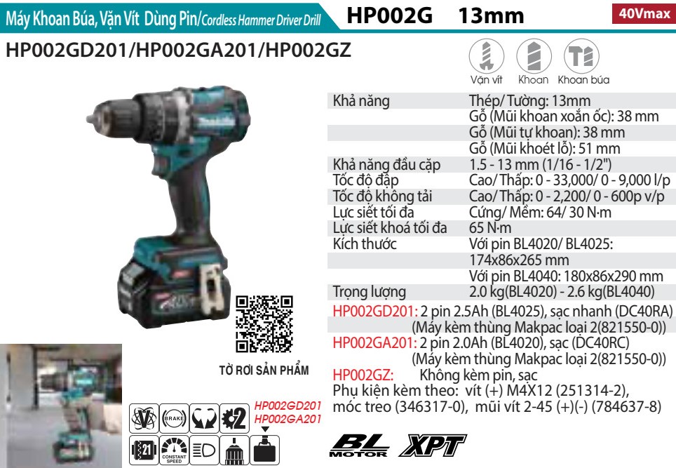 - Mã sản phẩm: HP002GZ (chưa bao gồm pin và sạc): Máy khoan búa, vặn vít dùng pin. 2 cấp tốc độ. 3 chức năng (khoan, vặn vít, khoan búa). Động cơ không chổi than, điện áp 40V, tốc độ không tải tối đa 2.200 vòng/phút, lực đập tối đa 33.000 lần/phút, trọng lượng bao gồm pin 2.0 - 2.6 Kg