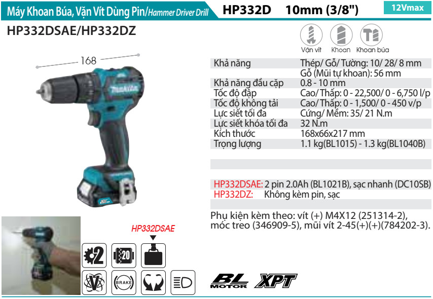 - Mã sản phẩm: HP332DZ ( chưa bao gồm pin và sạc): Máy khoan búa, vặn vít dùng pin. 2 cấp tốc độ. 3 chức năng (khoan, vặn vít, khoan búa), động cơ không chổi than, điện áp 12Vmax, tốc độ không tải tối đa 1.500 vòng/phút, lực đập tối đa 22.500 lần/phút, trọng lượng bao gồm pin 1.1 - 1.3 Kg