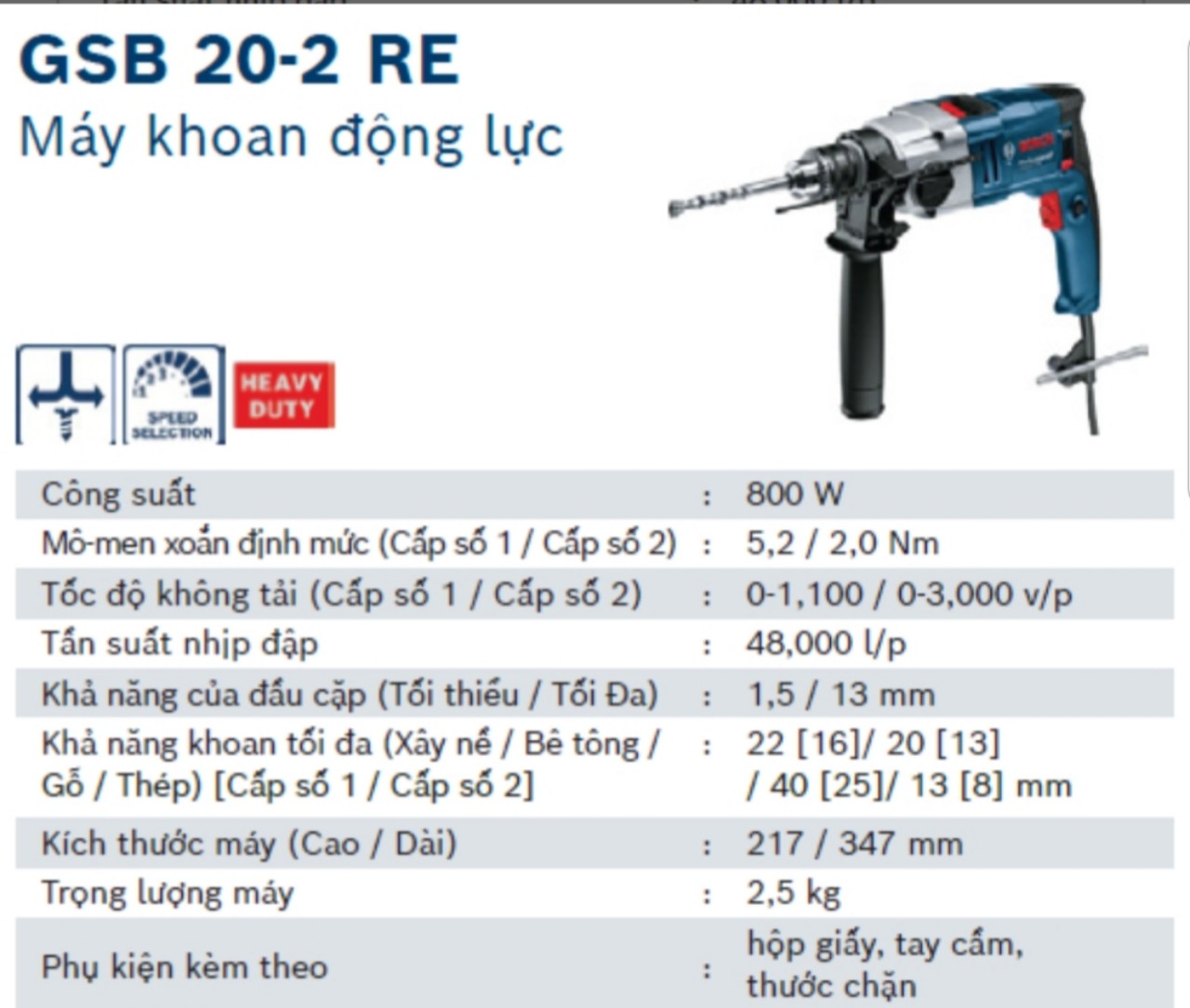 - Mã sản phẩm: GSB 20-2 RE. Máy khoan 2 chức năng: khoan, khoan đục; 2 cấp tốc độ, điện áp 220V, công suất 800W, tốc độ không tải tối đa 3.000 vòng/phút, lực xoắn tối đa 5.2 Nm, trọng lượng 2.5Kg.