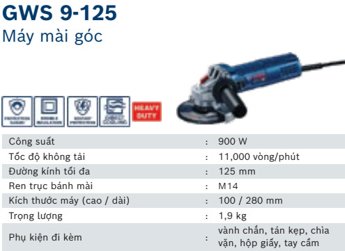 - Mã sản phẩm: GWS 9-125. Dòng máy mài sử dụng công tắc trượt ,công suất 900W, tốc độ không tải 11.000 vòng/phút, đường kính đá mài 125mm, trọng lượng 1.9Kg.