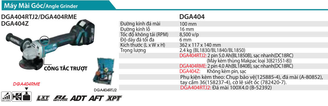 - Mã sản phẩm: DGA404RTJ2. Máy mài góc dùng pin, điện áp 18V, động cơ không chỗi than, công tắc trượt, đường kính đá mài 100mm, tốc độ không tải tối đa 8.500 vòng/phút, trọng lượng bao gồm pin 2.4Kg.