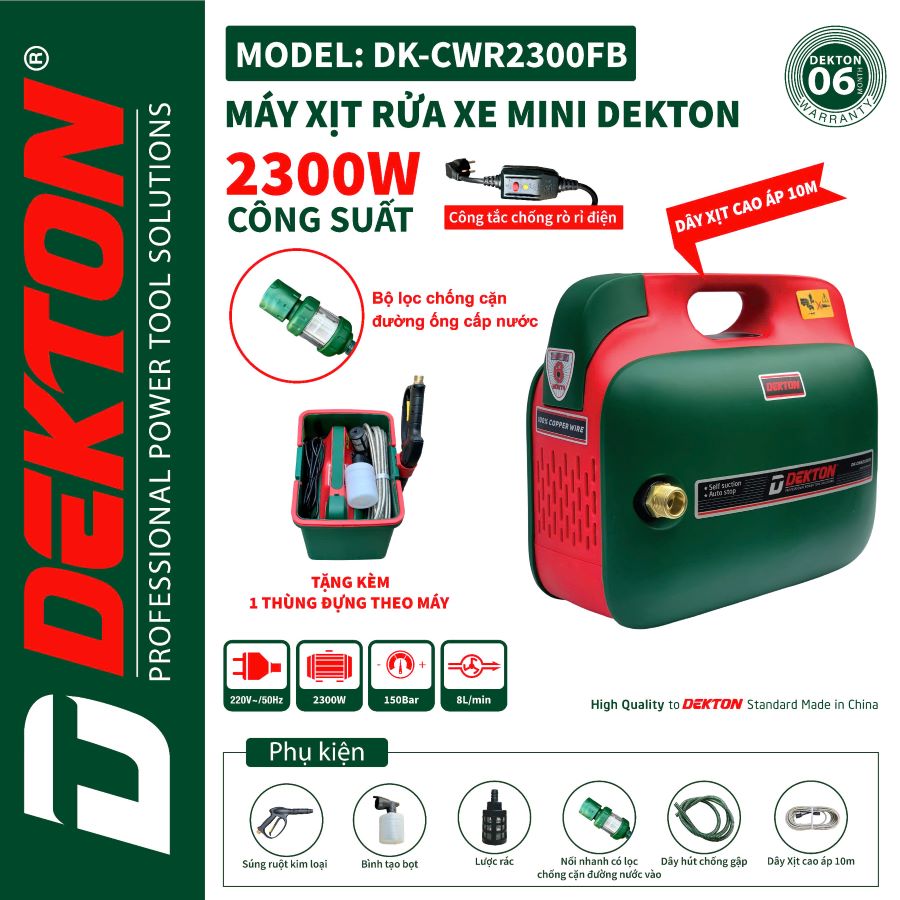 - Mã sản phẩm: DK-CWR2300FB. Máy xịt rửa xe mini, điện áp 220V, công suất 2.300W, áp lực nước 150 bar, lưu lượng 8 lít/phút..