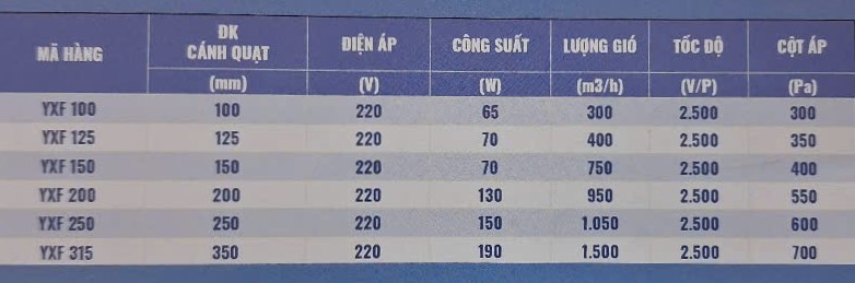 - Mã sản phẩm: YXF 100. Quạt cấp gió đường ống, điện áp 220V, công suất 65W, đường kính cánh quạt 100mm.