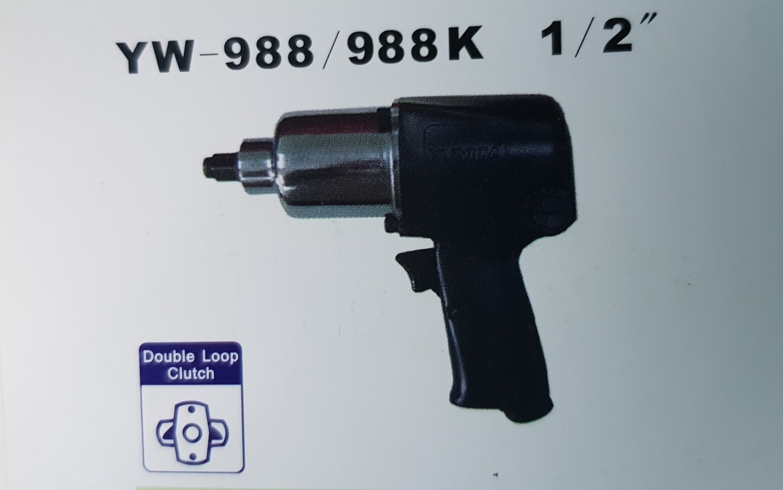 - Mã sản phẩm: YW-988K. Đầu nối tuýp 1/2 Inch, tốc độ không tải 7.000 vòng/phút, áp suất làm việc 90 psi, trọng lượng máy 2.7Kg.